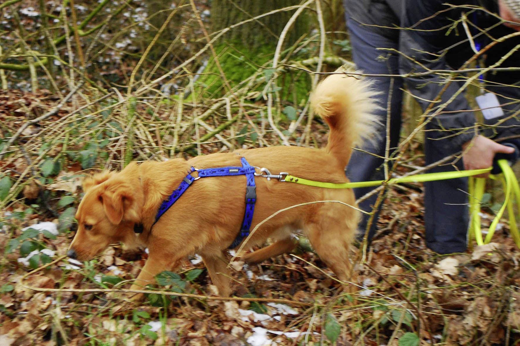 Damit während der Krimiwanderung keine Spuren und Beweisstücke unbrauchbar oder vernichtet werden, bleiben die Spürhunde während ihres Einsatzes an der Leine.